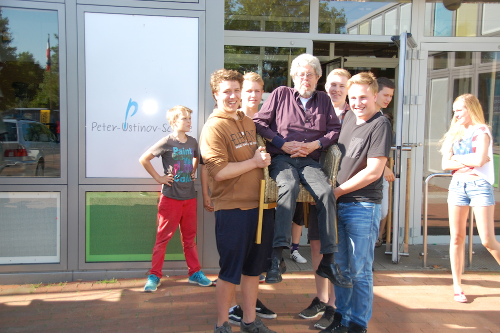 Die dritte Person, die es zu verabschieden galt, hatte 23 Jahre an der Integrierten Gesamtschule, dann Peter-Ustinov-Schule unterrichtet, davon 13 Jahre als Oberstufenleiter. Herr Sieh ging, wie es sich sicher schon herumgesprochen hat, zum Schuljahresende in den Ruhestand. Schon am Vormittag, in der großen Pause, verabschiedeten ihn alle Schüler/-innen und Lehrkräfte in der oberen Pausenhalle mit einem gemeinsamen Lied auf der Basis von „Verdammt – ich lieb Dich“, nun hieß es allerdings „ Verdammt – wir wolln Dich, dich nicht pensionier´n“. Es war eine eindrucksvolle Vorstellung, die ganze Schule inklusive der Lehrerschaft singen und musizieren zu hören. Und inmitten des ganzen Trubels saß Herr Sieh auf einem besonderen Stuhl und wurde danach symbolisch von einigen kräftigeren Schülern durch den Hauptausgang aus der Schule getragen. Die anschließende Lehrerabschiedsfeier geriet nicht minder eindrucksvoll: Zunächst nur mit einem leeren Korb ausgestattet traten alle Lehrerinnen und Lehrer während eines weiteren Liedes zu ihm vor und füllten diesen Korb mit je einem Abschiedsgeschenk: Na, was wohl? Natürlich mit Schokoladen aller Sorten und Geschmacksrichtungen ☺. Viele weitere Abschiedsgeschenke wurden überreicht, so manche Träne verdrückt. Ein ganz tolles großes „Wahl“-Plakat hatte Herr Mroczkowski unserem nun ehemaligen Oberstufenleiter gestaltet und überreicht … schaut es Euch selbst an auf den beigefügten Fotos.