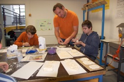 Feuerstelle. Zudem stellten sie die Aufgabenverteilung (Jäger, Sammler, Kleidungshersteller und Unterkunftsbauer) spielerisch nach. So wie jeder gute Steinzeitmensch erlernten auch sie die Kunst der Höhlenmalerei und die