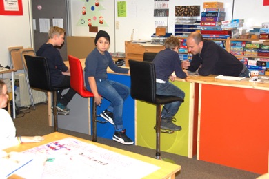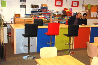 Der alte Tresen in der Freizeitstation war in die Jahre gekommen und abgenutzt, seine Erneuerung stand schon lange auf der Wunschliste von Jens Biesterfeld und seinem Team.  Und nun war es endlich soweit: Anfang Dezember kam der von der Tischlerei am Bistensee in zwei Teilen gefertigte neue Tresen in der Schule an. Tischlermeister Torsten Wriedt aus Alt-Duvenstedt, der das günstígste Angebot zur Herstellung abgegeben hatte, baute dann auch den von ihm und seiner Mannschaft gefertigte neue Stück auf. Es ist ca. 5 Meter lang und einen halben Meter breit. Dazu kamen noch sechs hohe Stühle in der Art von Barhockern, so dass die Freizeitstation jetzt gleich viel aufgewerteter aussieht. Die Nutzer, meistens Schülerinnen und Schüler der Unterstufe, aber auch Jens Biesterfeld und sein Team waren von der neuen Errungenschaft begeistert und haben den Tresen gleich seiner Bestimmung zugeführt. Die vorderen Farben des Tresens sind übrigens den bunten Farben der Fassade der Schule ganz ähnlich.