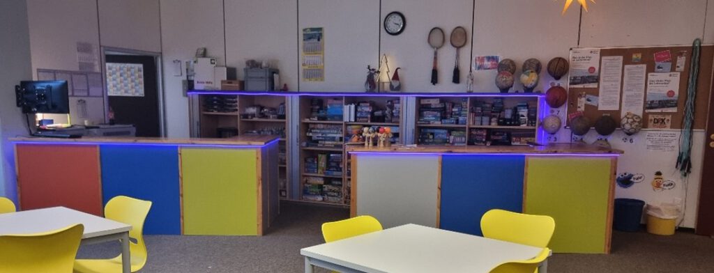 Um diese Räume und Bereich „versorgen“ und anbieten können, sind wir sehr froh, dass wir seit vielen Jahren mit dem DRK Landesverband Schleswig-Holstein e.V. Freiwilligendienste (https://freiwillig.sh/) erfolgreich zusammenarbeiten. Die FSJlerinnen und FSJler unterstützen einerseits den Freizeitleiter bei dem Verleih und Ausgabe von Spielen, Materialien und Geräten (und dabei, dass dieses auch wieder zurückkommt, wohin es / sie gehören, bzw. dass es nachbestellt wird), dem Verwalten die Listen für die AGs und den Instrumentalunterricht, tragen Sorge dafür, dass die Leitenden der AGs und des Instrumentalunterrichtes Schlüssel und Material haben.