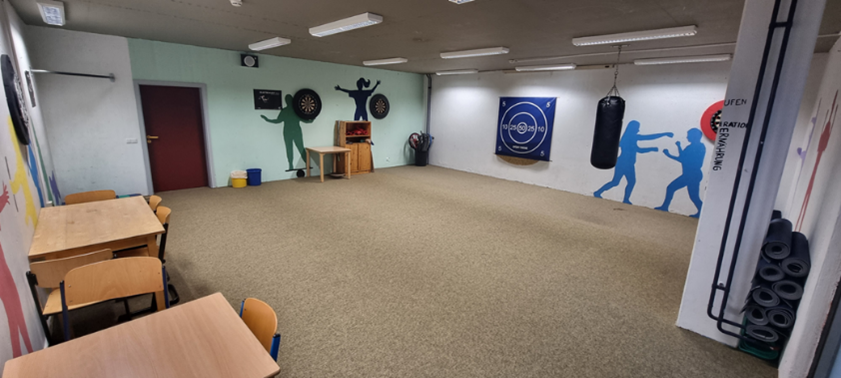 Dieser Raum ist im Wandel und es werden neue „Geräte“ dazukommen: eine mobile Tischtennisplatte, Geräte zur Balance- und Konzentrationsübung, Pratzen, Matten…