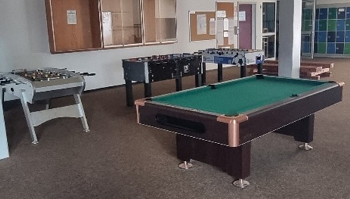 Hier stehen drei Tischkicker und ein Billardtisch, die in der „Mittagszeit“ und den kurzen Pausen genutzt werden können. Auch Tische und Sitzmöglichkeiten bietet dieser Bereich, einerseits für die Lernzeit, andererseits, für den Fall, dass es in der Freizeitstation mal zu eng ist.